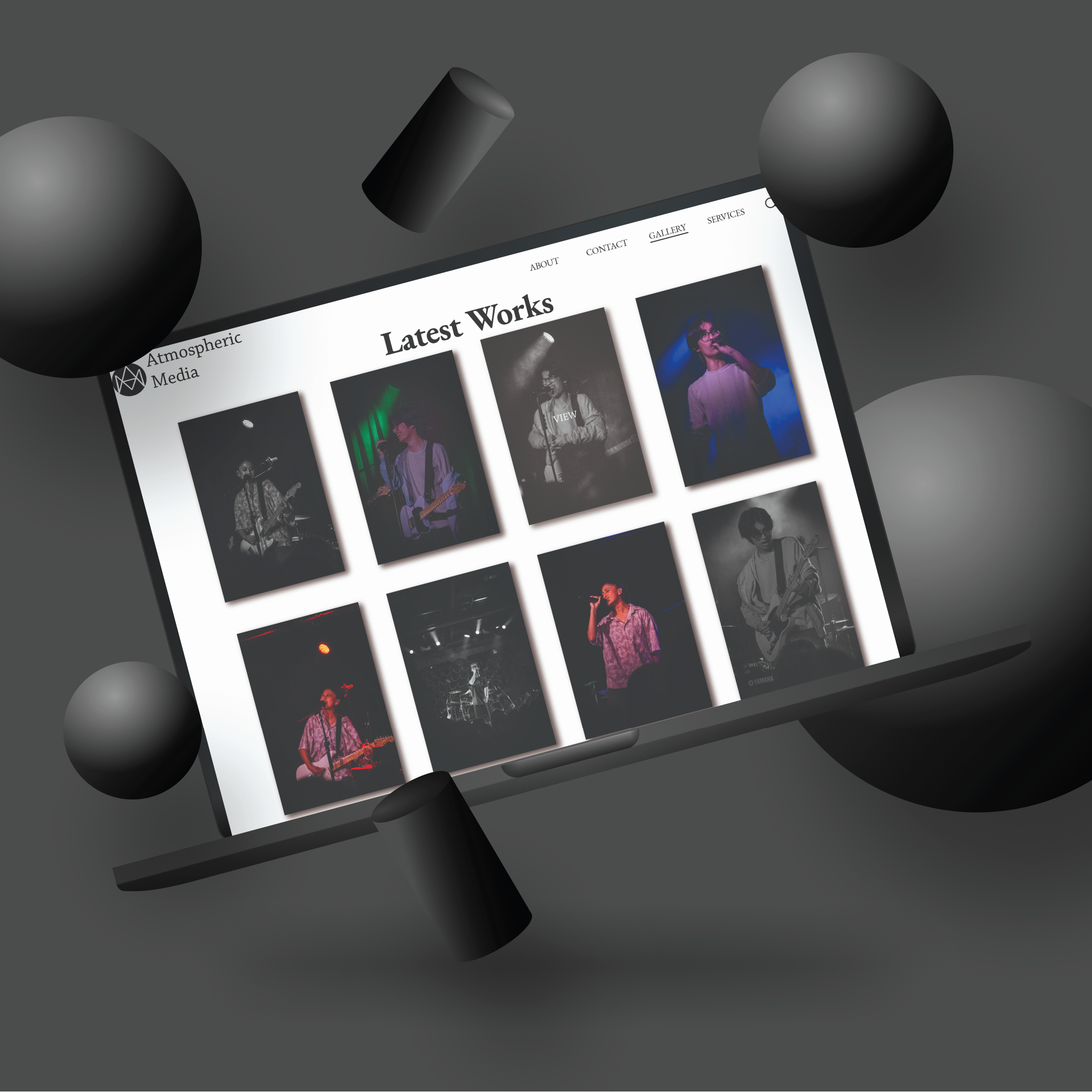 Launched Atmospheric Media, a branding and visual identity project including logo, business card, magazine spread, and website layout.